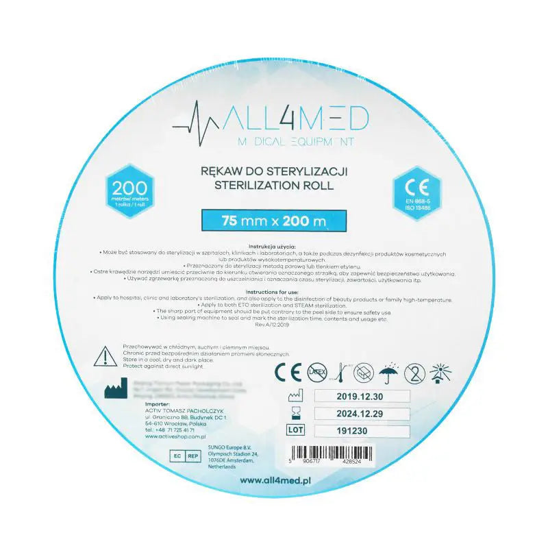 Die All4Med Sterilisationshülle ist eine hochwertige Lösung für die sichere Sterilisation medizinischer Instrumente. Mit einer Größe von 7,5 cm x 200 m und einer reißfesten Folie (83 µm dick) in transparentem Blau erfüllt sie alle relevanten medizinischen Standards.