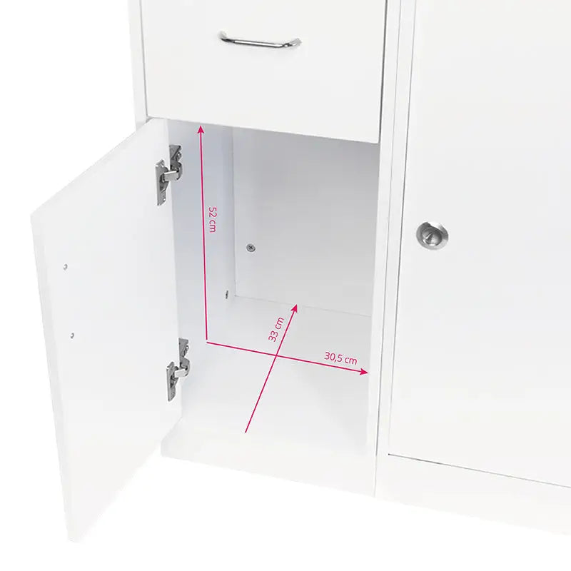 In seinem inneren Teil befinden sich Schränke und Schubladen sowie der Zugang zur Vitrine.