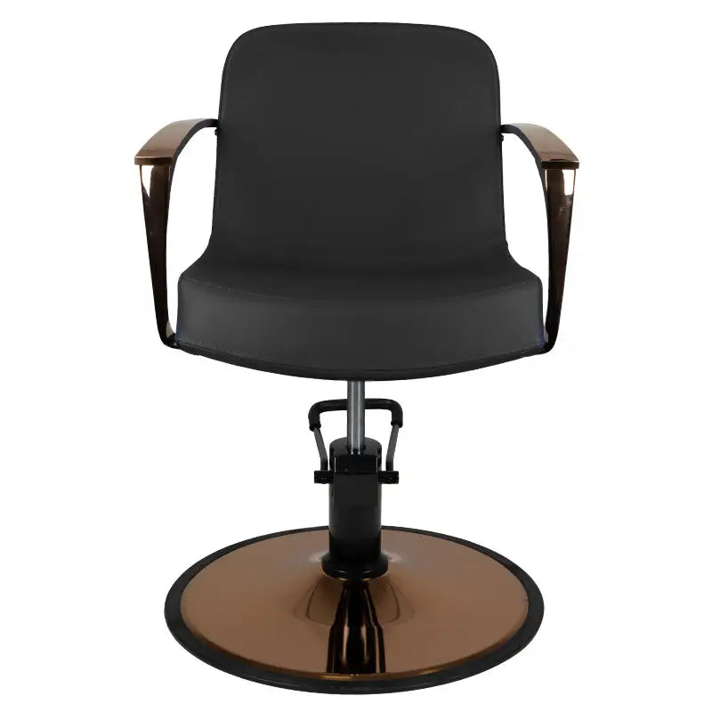 Ein moderner, hochwertiger Friseurstuhl mit einem einzigartigen Design. Metallelemente glänzen in der Farbe von Kupfer und verstärken das Gefühl von Luxus. Ein sehr komfortables Möbelstück ist ideal für moderne Salons geeignet. Es wurde speziell geformt, um für eine komfortable Position des Kunden bei der Behandlung zu sorgen. Es verfügt über verstellbare Höhe. Es ist stabil und solid. Die Polsterung wurde aus einem hochwertigen Ökoleder hergestellt. Farbe: Schwarz