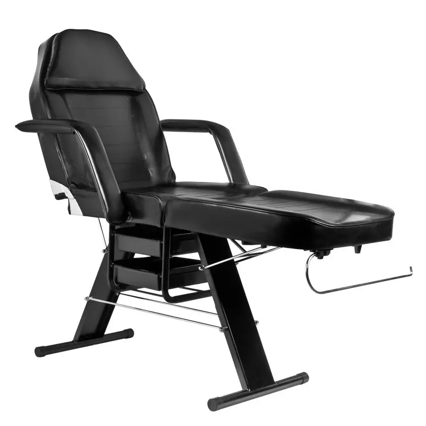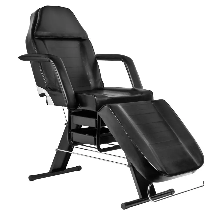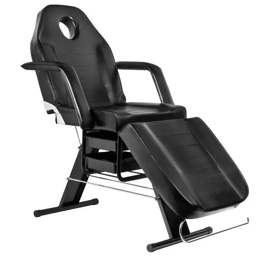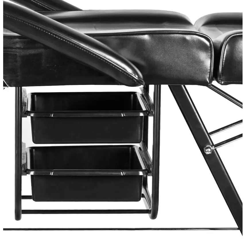 Die Kosmetikliege A-202 mit einem Gesichtsausschnitt in der Kopfstütze und mit praktischen Aufbewahrungsladen. Sie ist ideal für Kosmetik, für vorteilhafte Gestaltung des Gesichts mit Make-up oder für Massage geeignet. Sie verfügt über Armlehnen und über einen Gesichtsausschnitt in der Kopfstütze, der bei Nichtgebrauch abgedeckt werden kann. Die Bespannung der Kosmetikliege ist leicht zu reinigen, aus dem Ökoleder hergestellt, erfüllt die strengen EU-Anforderungen, ist ästhetisch und besitzt vernickelte Metallteile. Unter dem Sitz ist ein Bügel für Einwegbetttuch, Servietten oder Handtuch befestigt. Die Liege ist in Schwarz erhältlich.