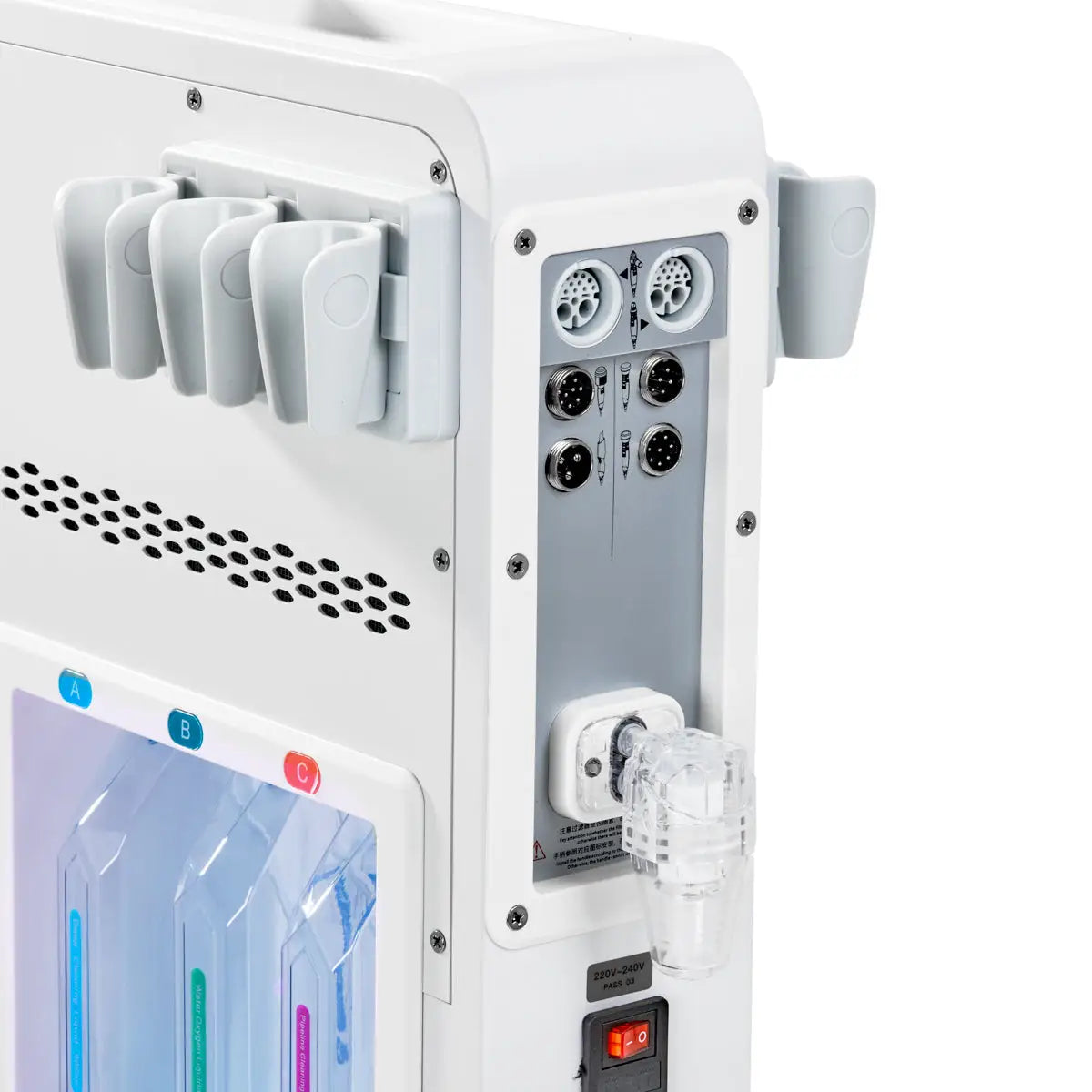 Das praktische Gerät zeichnet sich durch sein modernes und ergonomisches Design aus und ist ein ästhetisches Element des Schönheitssalons. Seine kompakten Abmessungen und die Mobilität durch funktionale Räder erleichtern die Lagerung und den Transport. Es ist mit einem funktionalen System von Wassertanks und Flüssigkeiten ausgestattet, die für die Behandlungen erforderlich sind, was ein komfortables und hygienisches Arbeiten gewährleistet. Der Kopfständer bietet einfachen Zugriff auf das notwendige Zubehör, und die Ablage auf der Oberseite ermöglicht es Ihnen, die Spitzen zu verstauen. Die Materialien sorgen für Langlebigkeit und einfache Reinigung , was sich in einem hohen Bedienkomfort niederschlägt.