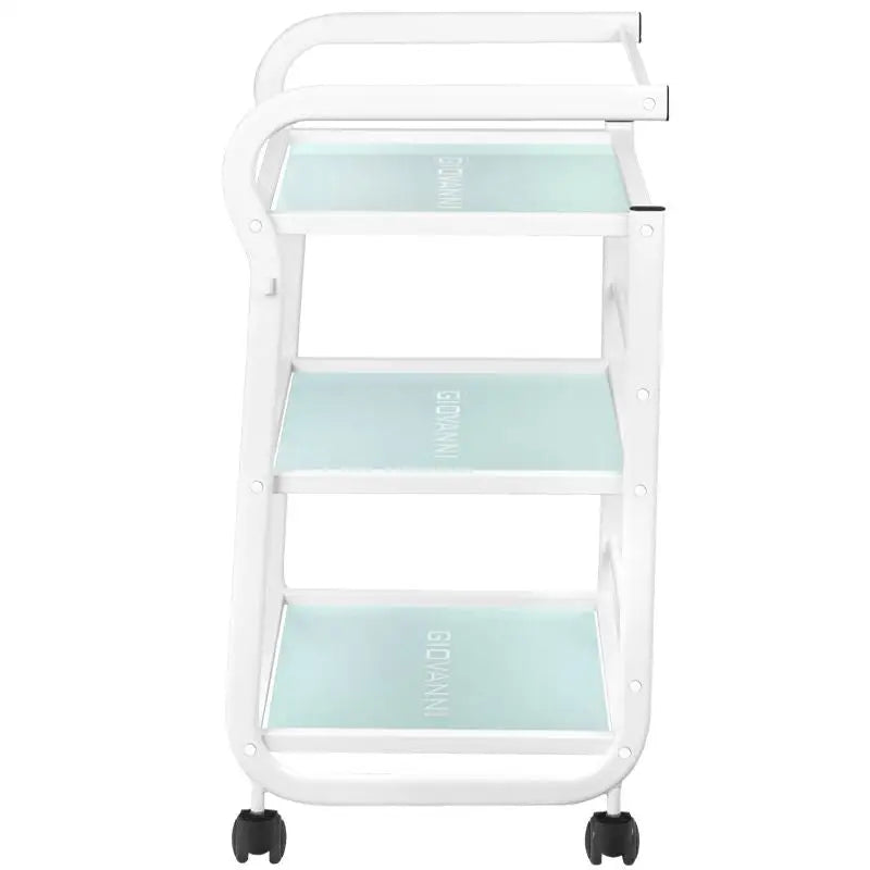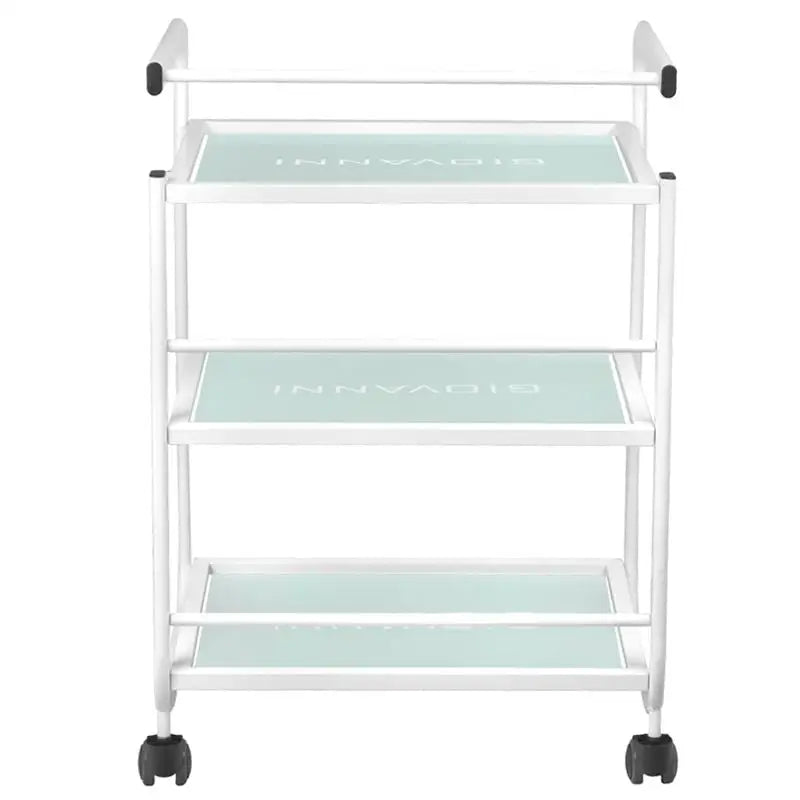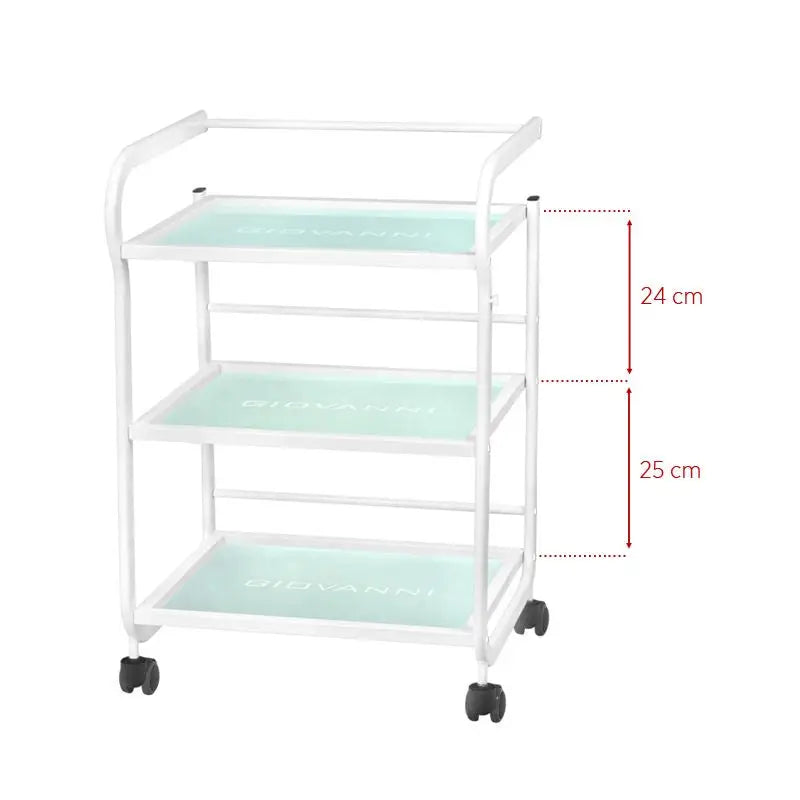 Ein Metall-Glas-Kosmetikwagen für Kosmetikgeräte mit Rädern. Er verfügt über drei Glasfächer mit eingraviertem Logo GIOVANNI. Abmessungen: Wagen-Abmessungen: 53*43,5*79 Wagen-Gewicht: 14 kg Technische Daten: - Farbe: Weiß - Glasfächer - Gummiräder: 4 St. Verpackungsabmessungen: 85*45,5*15,5 cm - Bruttogewicht: 19,3 kg - Verpackungsmenge: 1