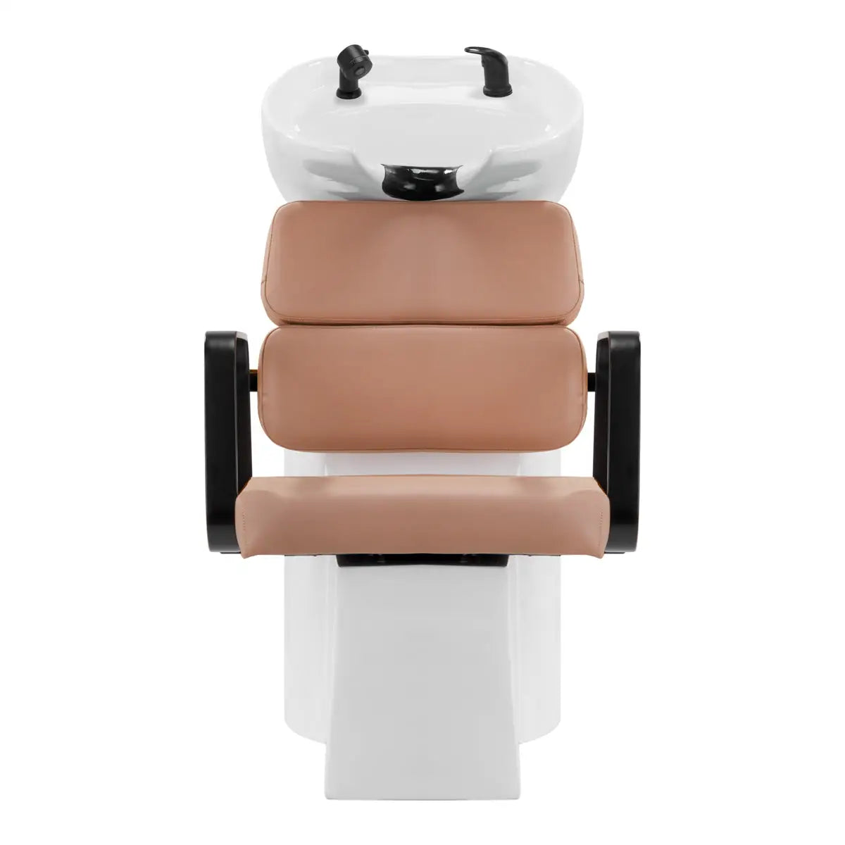 Die entsprechende Tiefe der Waschtischschale aus weißer Keramik verhindert übermäßiges Spritzen von Wasser oder Produkten, die während der Behandlung verwendet werden. So kann eine Vielzahl von Dienstleistungen komfortabel und effizient durchgeführt werden. Der Neigungswinkel der Schale lässt sich verstellen, so dass sie leicht an die individuellen Bedürfnisse angepasst werden kann. Die hohe Qualität der verwendeten Materialien macht das Waschbecken langlebig, resistent gegen Verfärbungen und Kratzer und sehr leicht zu reinigen. Ein richtig profilierter Kragen und eine geneigte Rückenlehne bieten Halt und Komfort beim Haarewaschen, und dank der bequemen Kunststoffauflage in Schwarztönen wird der Kunde keine Unannehmlichkeiten im Zusammenhang mit der Kälte der Keramikoberfläche empfinden.