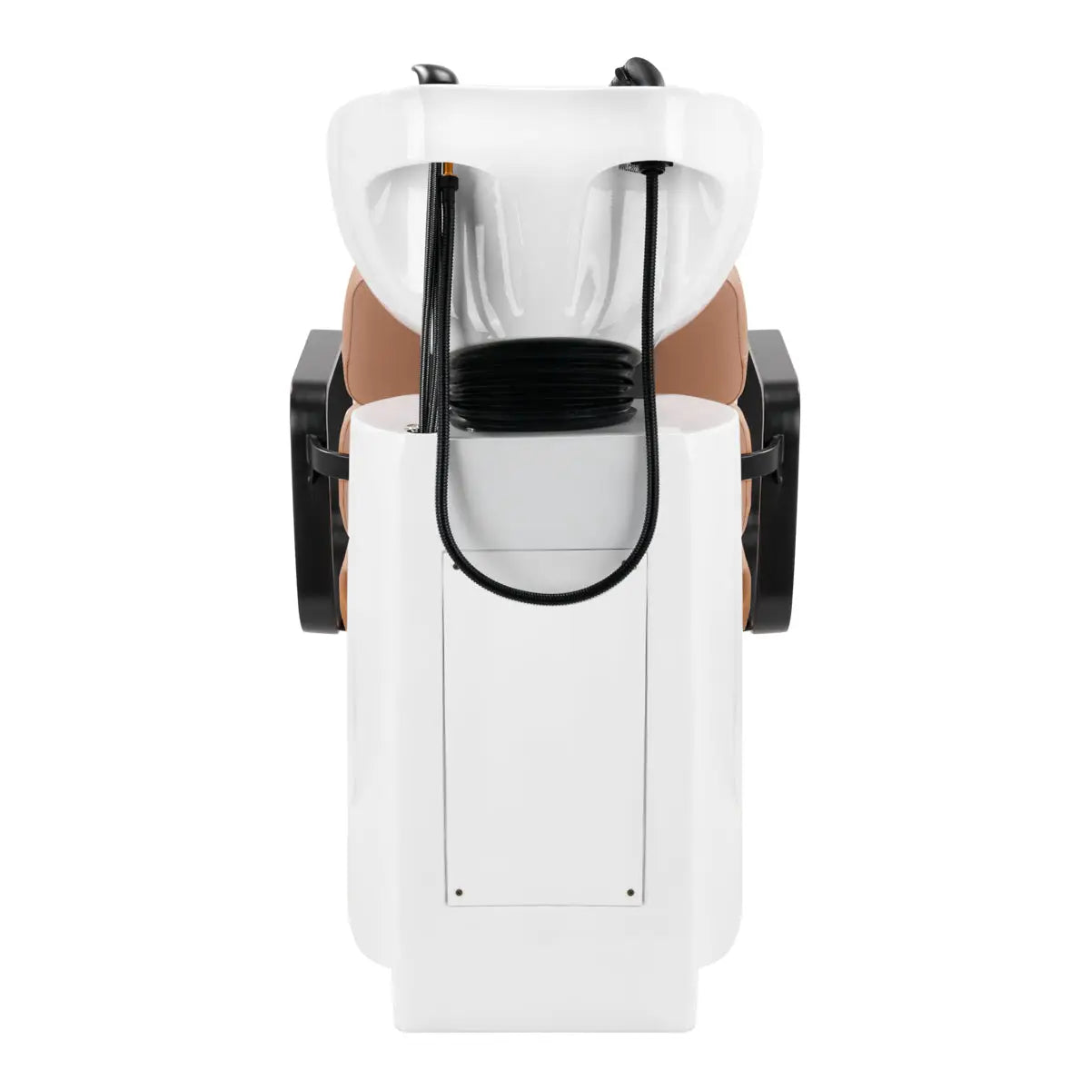 Die praktische Waschanlage ist mit einem Mischerakku ausgestattet, der freien Zugang zu warmem und kaltem Wasser bietet. Dies erleichtert die Anpassung der Temperatur an die individuellen Vorlieben des Kunden. Ein spezieller Platz zum Ablegen des Hörers rationalisiert die Arbeit, und ein verchromter Stopfen mit einem speziellen Sieb ermöglicht es Ihnen, den Wasserfluss zu kontrollieren und hohe Hygienestandards im Salon aufrechtzuerhalten. Der Wasseranschluss wurde im Inneren des Sockels platziert, was ein effizientes Verbergen der Rohre ermöglicht. Ein wesentlicher Vorteil dieses Modells ist das Loch zwischen der Rückenlehne und der Sitzfläche, das es einfacher macht, das Wohnzimmer sauber zu halten, so dass Sie Schmutz leicht aus allen Ecken und Winkeln des Stuhls fegen können. Die Waschanlage wurde so profiliert, dass sie den Komfort während der verschiedenen Behandlungen gewährleistet und eine angemessene Rückenstütze garantiert. Die Kombination aus Funktionalität und Ausstattung macht das Arbeiten in einem Friseursalon noch komfortabler.
