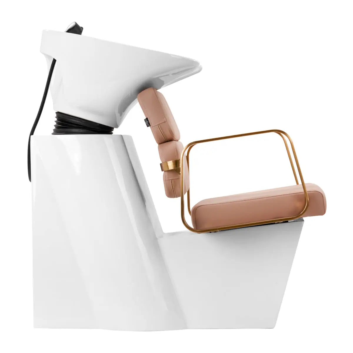 Die praktische Waschanlage ist mit einem Mischerakku ausgestattet, der freien Zugang zu warmem und kaltem Wasser bietet. Dies erleichtert die Anpassung der Temperatur an die individuellen Vorlieben des Kunden. Ein spezieller Platz zum Ablegen des Hörers rationalisiert die Arbeit, und ein verchromter Stopfen mit einem speziellen Sieb ermöglicht es Ihnen, den Wasserfluss zu kontrollieren und hohe Hygienestandards im Salon aufrechtzuerhalten. Der Wasseranschluss wurde im Inneren des Sockels platziert, was ein effizientes Verbergen der Rohre ermöglicht. Ein wesentlicher Vorteil dieses Modells ist das Loch zwischen der Rückenlehne und der Sitzfläche, das es einfacher macht, das Wohnzimmer sauber zu halten, so dass Sie Schmutz leicht aus allen Ecken und Winkeln des Stuhls fegen können. Die Waschanlage wurde so profiliert, dass sie den Komfort während der verschiedenen Behandlungen gewährleistet und eine angemessene Rückenstütze garantiert. Die Kombination aus Funktionalität und Ausstattung macht das Arbeiten in einem Friseursalon noch komfortabler.