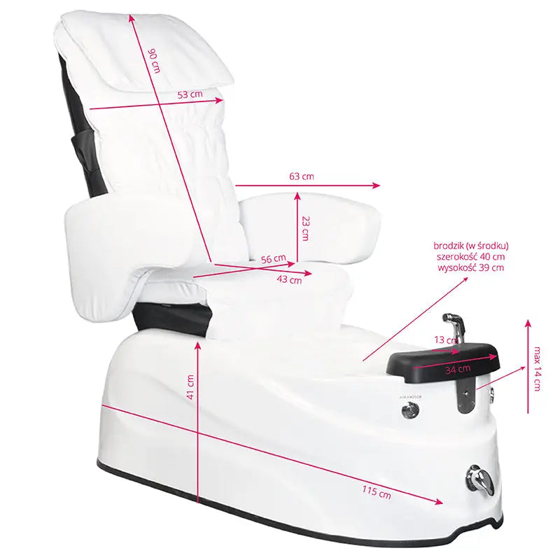 Der Fußpflegestuhl verfügt über eine Rückenmassagefunktion sowie die Möglichkeit der elektronischen Steuerung von Sitz (Einstellung des Abstands zwischen Sitz und Fußbadewanne) und Rückenlehne je nach Bedarf. Die Fußbadewanne ist mit einer Fußstütze ausgestattet, die individuell an die Bedürfnisse des Kunden angepasst werden kann.