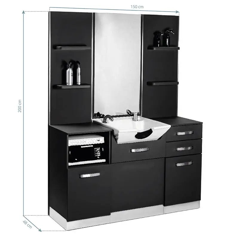 Ein moderner Friseurbedienplatz in Grau mit silbernen Elementen. Ein großer Spiegel, ein Waschbecken und Schubladen sorgen für Funktionalität und das gesamte Möbelstück ist erstklassig gefertigt. Dies ist ein elegantes und zugleich universelles Element des Raums, das den Charakter jedes Friseursalons betont.