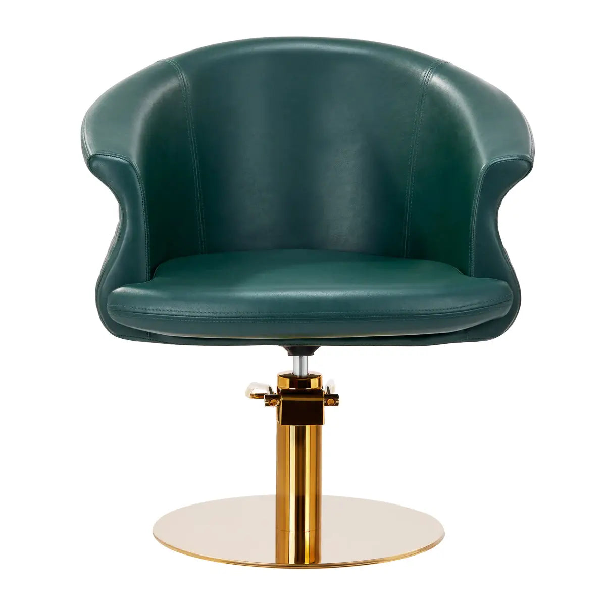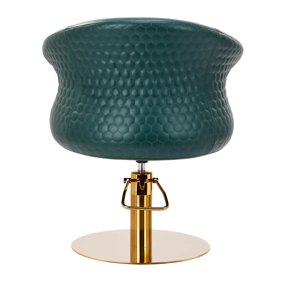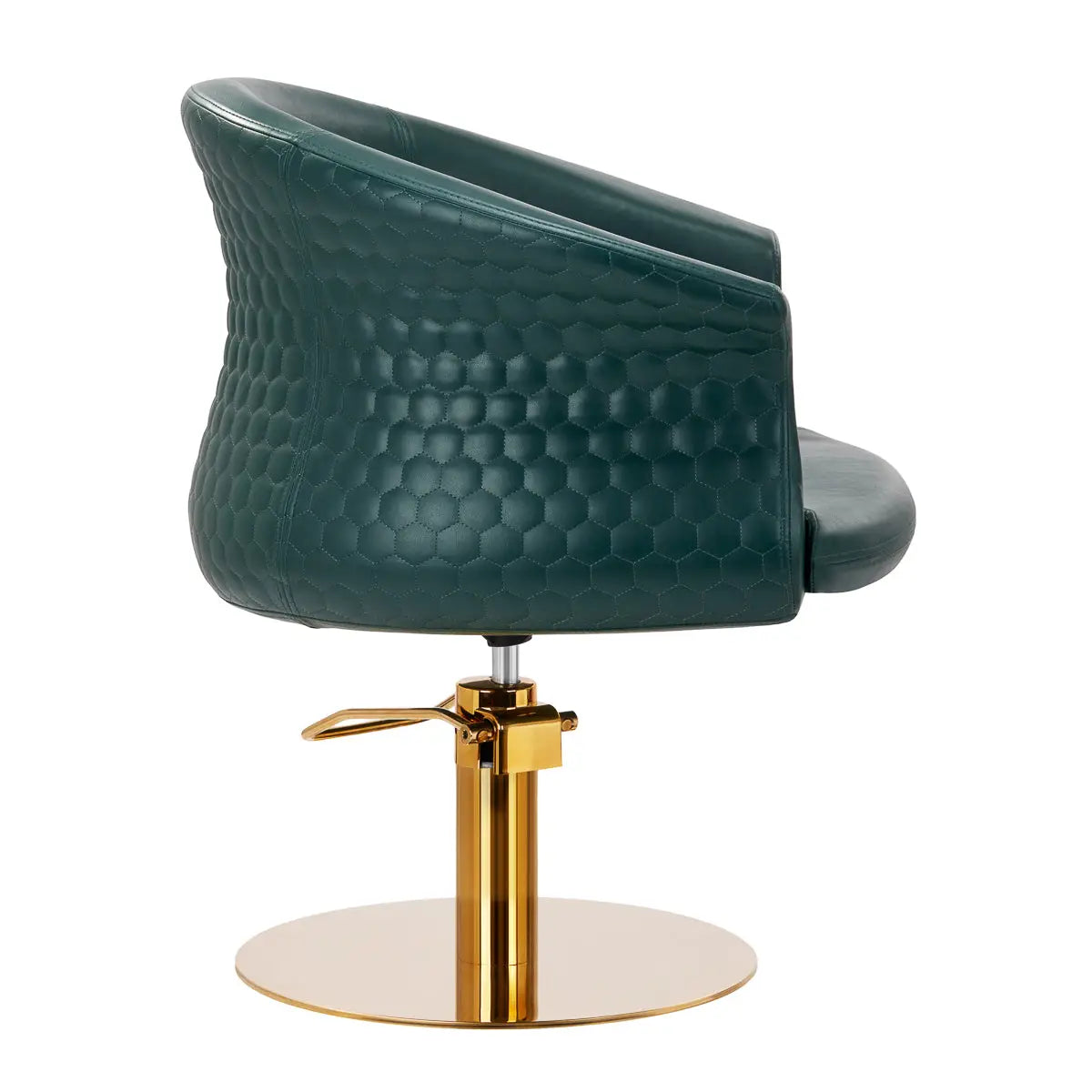 Das optisch ansprechende Möbelstück ist mit strapazierfähigem, verformungsbeständigem Schaumstoff gefüllt, während die Polsterung aus angenehm haptischem Kunstleder in Grüntönen besteht. Die verwendeten Materialien machen die Geräte langlebig, komfortabel zu bedienen, feuchtigkeitsbeständig und leicht zu reinigen. Dekorative Steppungen in Fünfecken und eine auffällige Form verleihen ihm einen einzigartigen Charakter. Der Friseurstuhl Gabbiano Wersal zeichnet sich durch sein raffiniertes Design aus, das den Stuhl in vielen eleganten Salons großartig aussehen lässt.