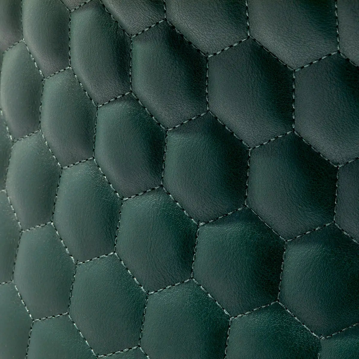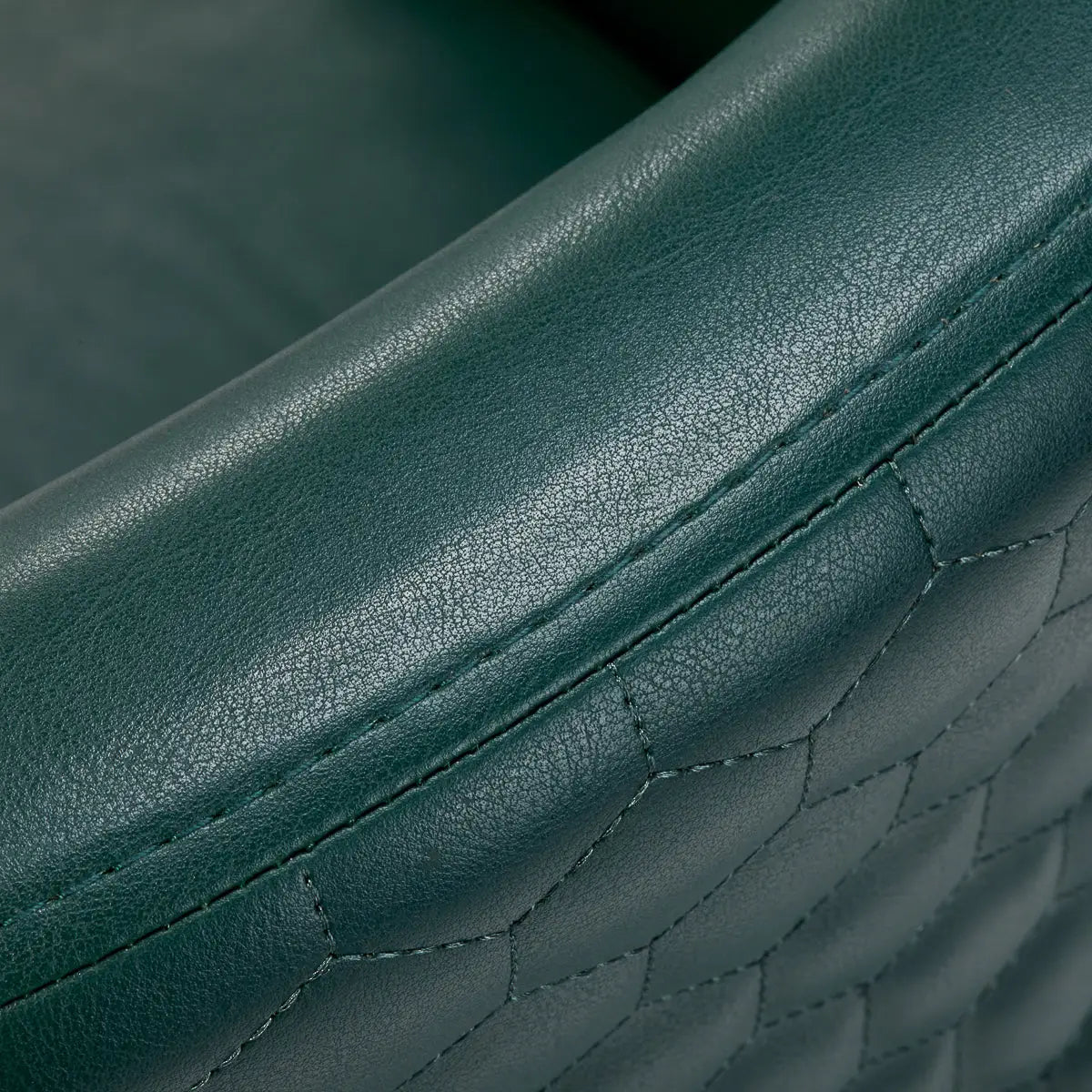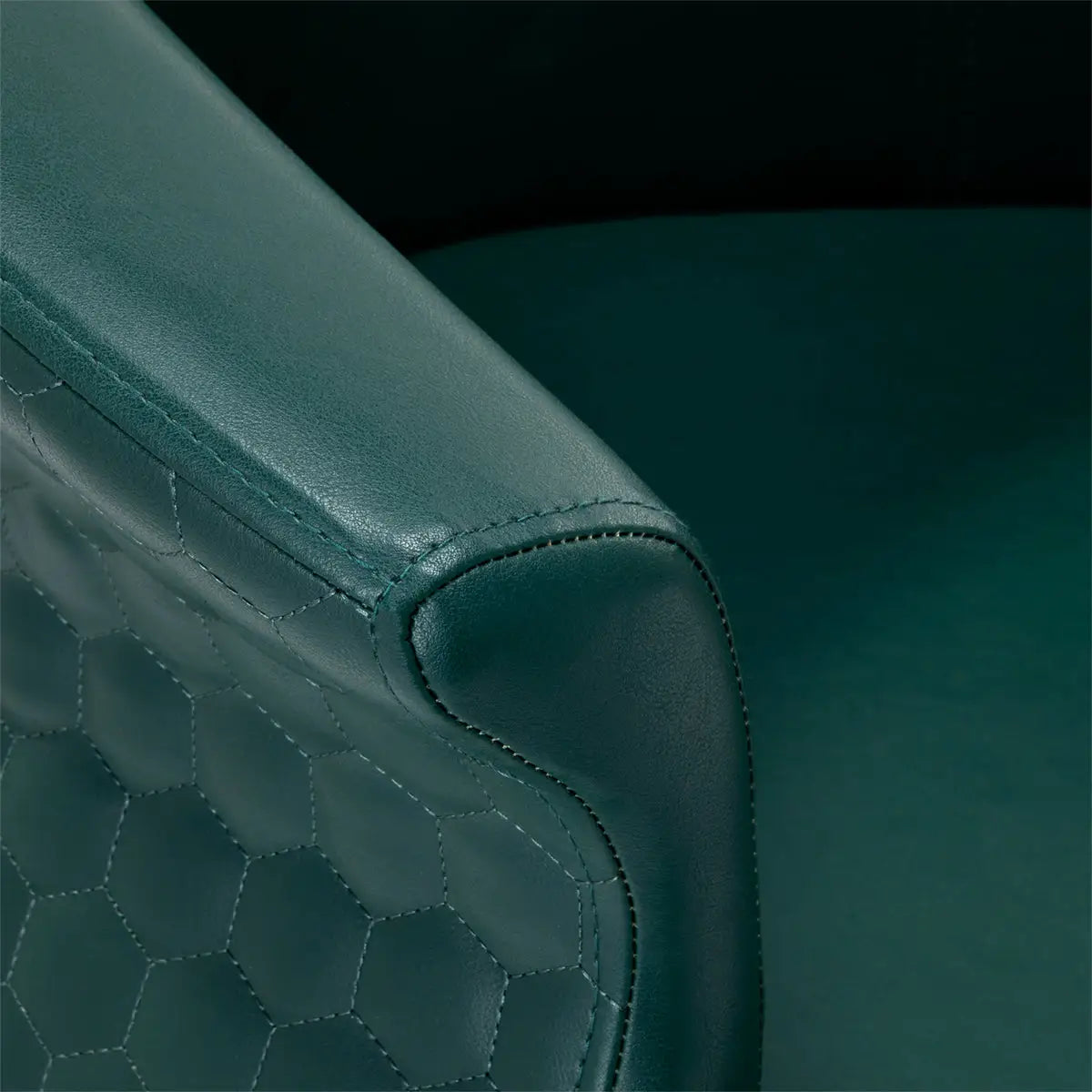 Das optisch ansprechende Möbelstück ist mit strapazierfähigem, verformungsbeständigem Schaumstoff gefüllt, während die Polsterung aus angenehm haptischem Kunstleder in Grüntönen besteht. Die verwendeten Materialien machen die Geräte langlebig, komfortabel zu bedienen, feuchtigkeitsbeständig und leicht zu reinigen. Dekorative Steppungen in Fünfecken und eine auffällige Form verleihen ihm einen einzigartigen Charakter. Der Friseurstuhl Gabbiano Wersal zeichnet sich durch sein raffiniertes Design aus, das den Stuhl in vielen eleganten Salons großartig aussehen lässt.