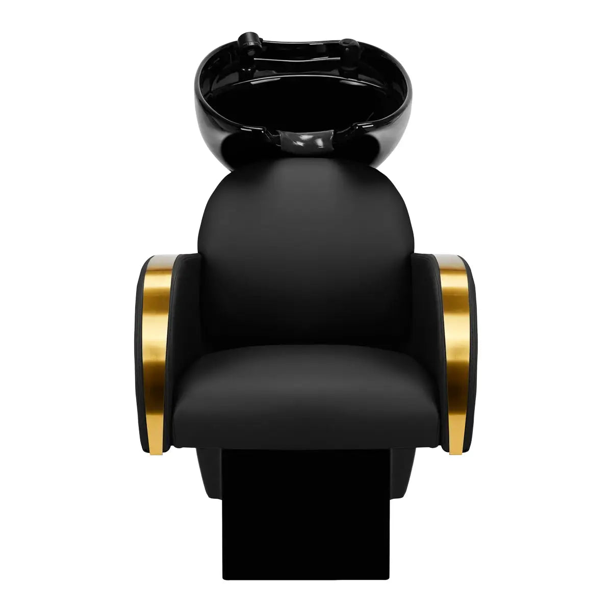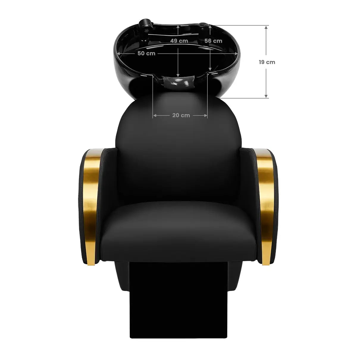 Ein richtig profilierter Stuhl, der mit strapazierfähigem Schaumstoff gefüllt ist, sorgt für einen hohen Nutzungskomfort, und elegante Armlehnen ermöglichen die korrekte Positionierung der Schultern des Kunden. Die im optimalen Winkel platzierte Rückenlehne ermöglicht es Ihnen, die richtige Position einzunehmen, und fördert eine hervorragende Unterstützung der Wirbelsäule. Die schwarze Beschichtung und die in Goldtönen lackierten Metalloberflächen verleihen ihm einen Ausdruck zeitloser Eleganz und garantieren zusätzlich eine lange Haltbarkeit und Reinigungsfreundlichkeit. Das klassische Finish, das die Waschanlage auszeichnet, lässt sie in fast jedem Raum großartig aussehen. Ein kompletter Satz Armaturen in Schwarztönen ist im Lieferumfang enthalten, einschließlich eines Wasserhahns, eines Duschkopfs und spezieller Schläuche, um einen kompletten Satz Werkzeuge für die Arbeit bereitzustellen.