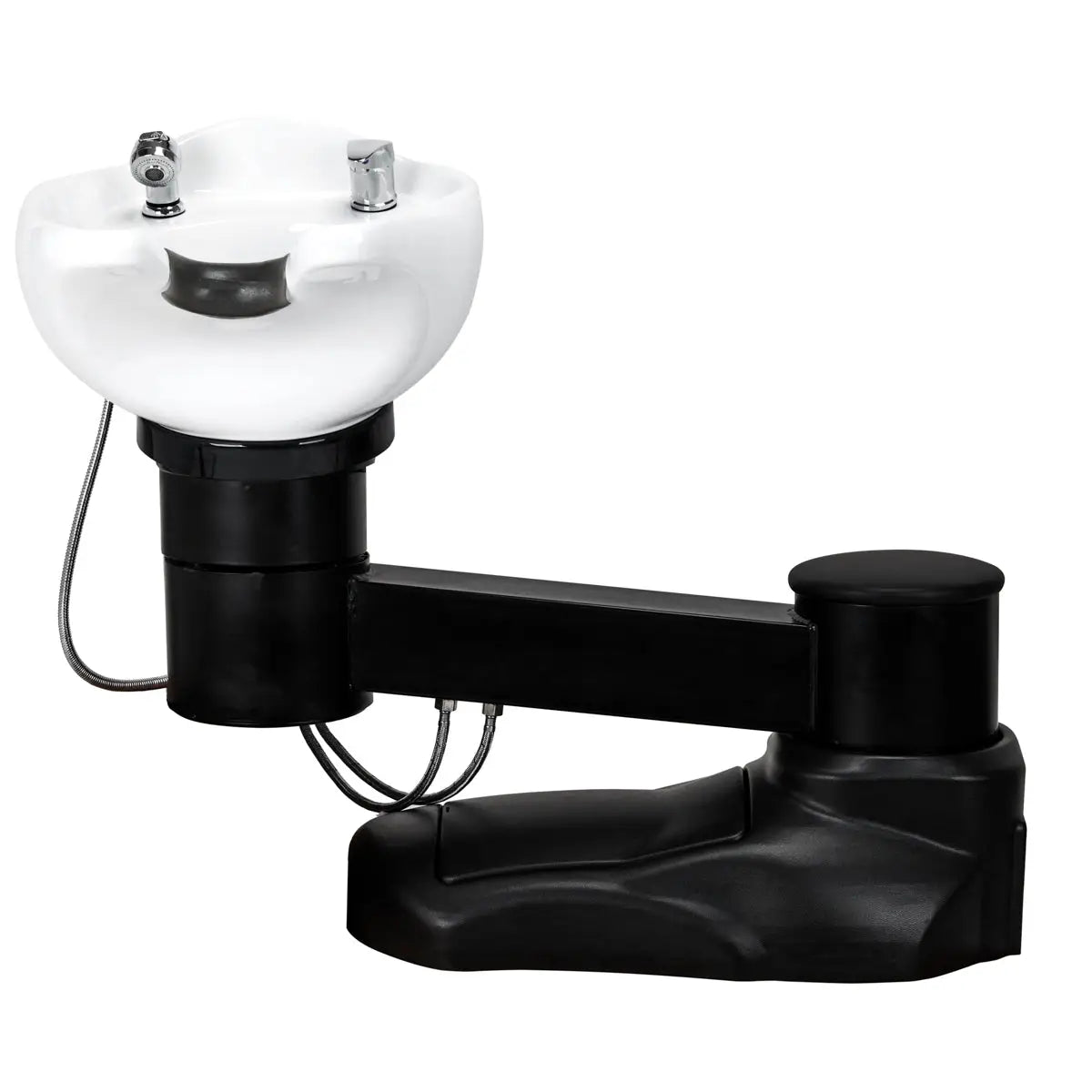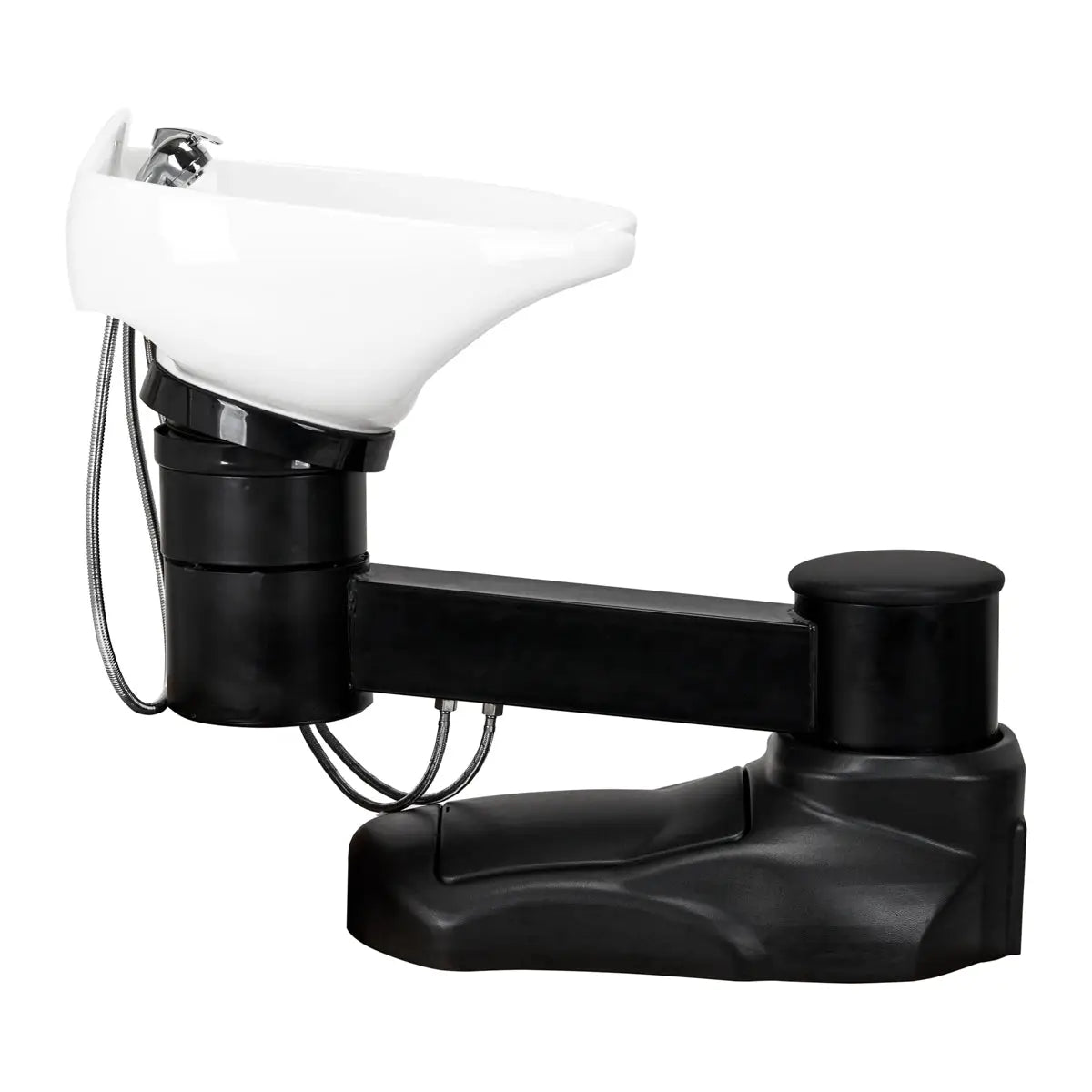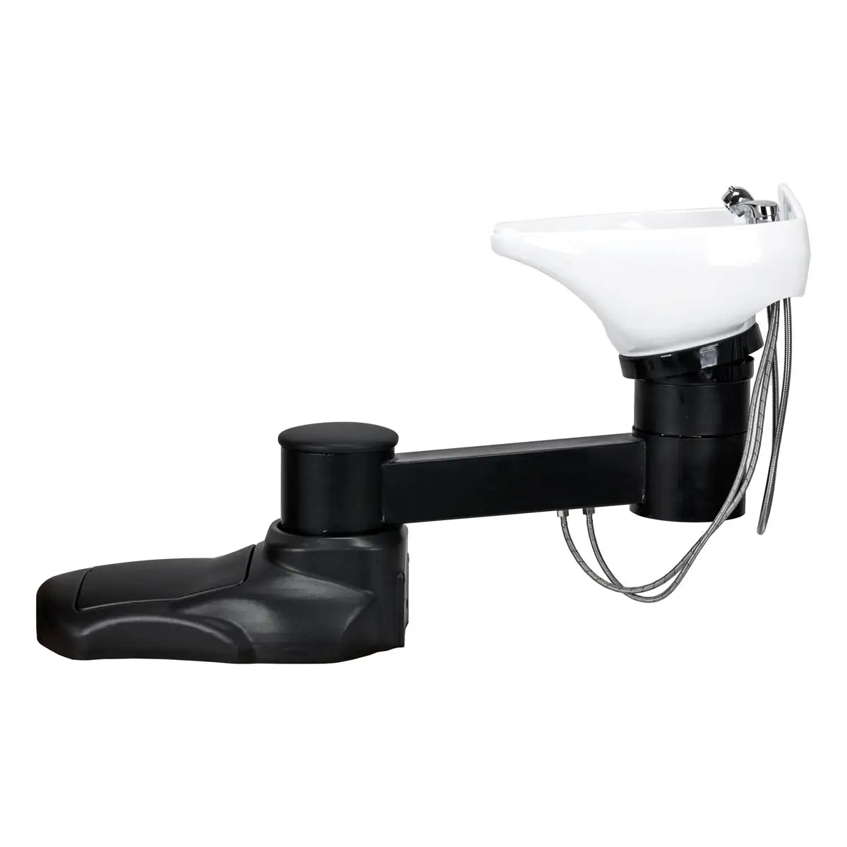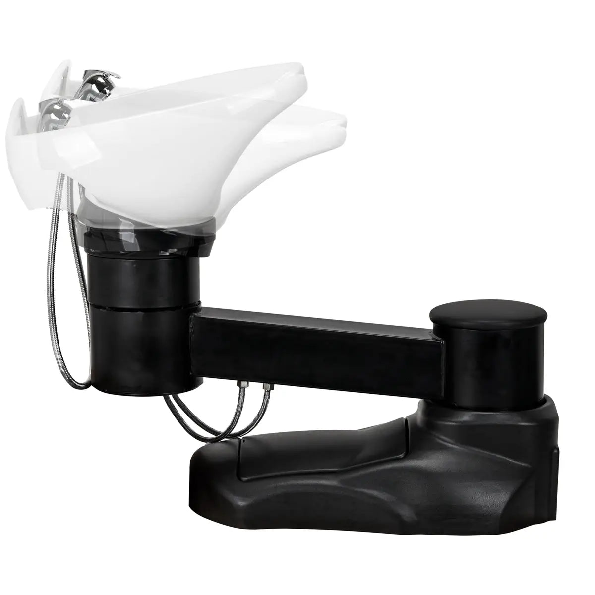 Die ästhetische Waschtischschale aus Keramik in Weißtönen hat die richtige Tiefe, dank derer sie übermäßiges Spritzen von Wasser und speziellen Produkten verhindert, die während der Behandlungen verwendet werden. Dadurch kann eine breite Palette von Dienstleistungen frei und effizient erbracht werden. Das verwendete hochwertige Material macht das Waschbecken langlebig, resistent gegen Verfärbungen und Kratzer und sehr leicht zu reinigen. Der Neigungswinkel der Schale lässt sich verstellen, so dass sie leicht an die individuellen Bedürfnisse angepasst werden kann. Ein richtig profilierter Kragen und eine geneigte Rückenlehne bieten Halt und Komfort beim Haarewaschen, und dank der bequemen Kunststoffauflage in Schwarztönen wird der Kunde keine Unannehmlichkeiten im Zusammenhang mit der Kälte der Keramikoberfläche empfinden.