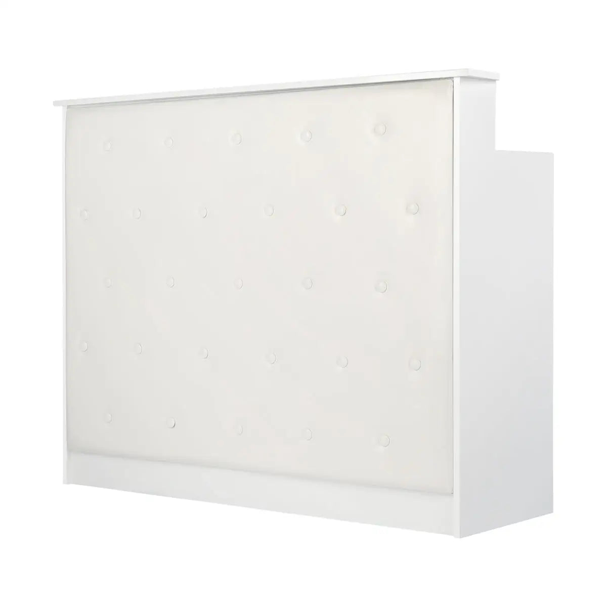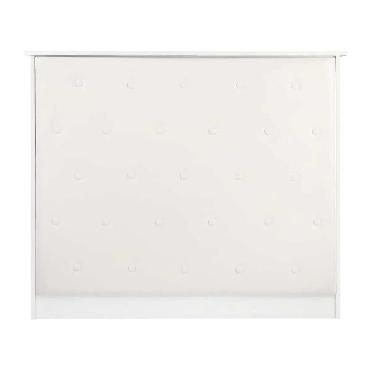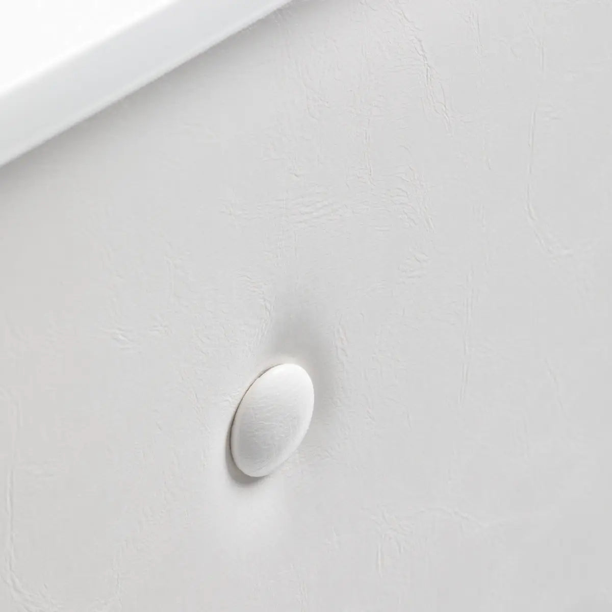 Dieses Möbelstück besteht aus hochwertiger, langlebiger laminierter Platte in Weißtönen, und glatte Oberflächen verursachen keine Probleme bei der Aufrechterhaltung der Sauberkeit – bei Verschmutzung einfach mit einem feuchten Tuch abwischen. Der dekorative Frontteil wurde mit Kunstleder in Weißtönen bezogen, was ihm einen stilvollen Stil verleiht, die Langlebigkeit der Möbel und eine einfache Reinigung gewährleistet. Dekorative Knöpfe verleihen zusätzlich Eleganz und Einzigartigkeit und unterstreichen den Charakter des Interieurs. Der Empfang wurde sorgfältig hergestellt, ist stabil und die verwendeten Materialien ermöglichen eine langjährige effektive Nutzung.